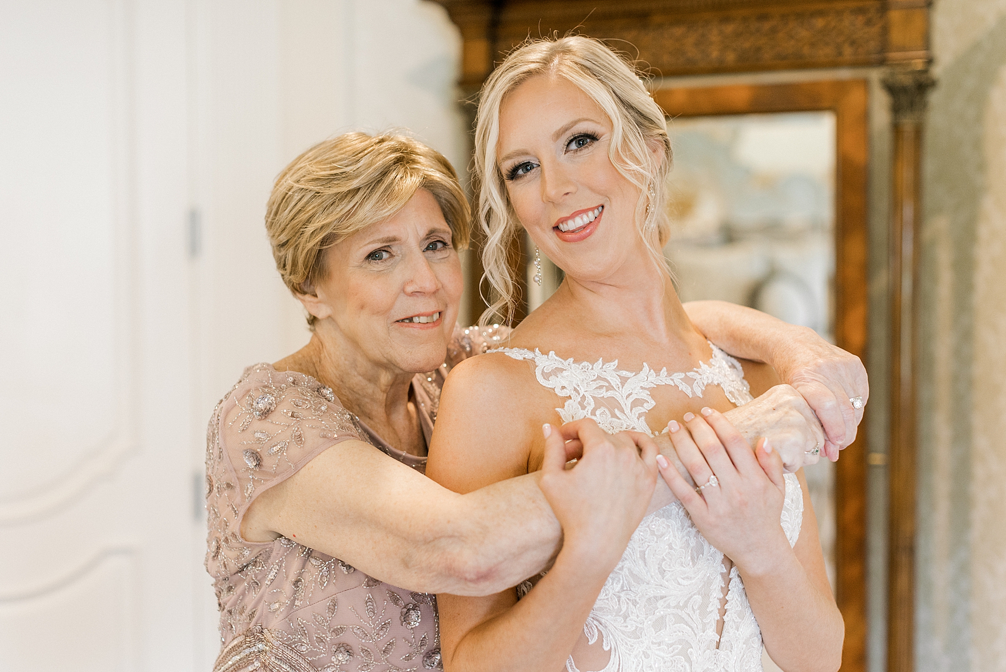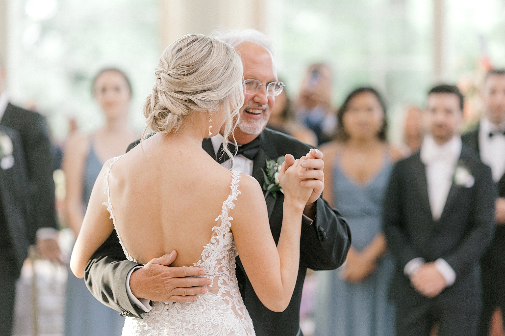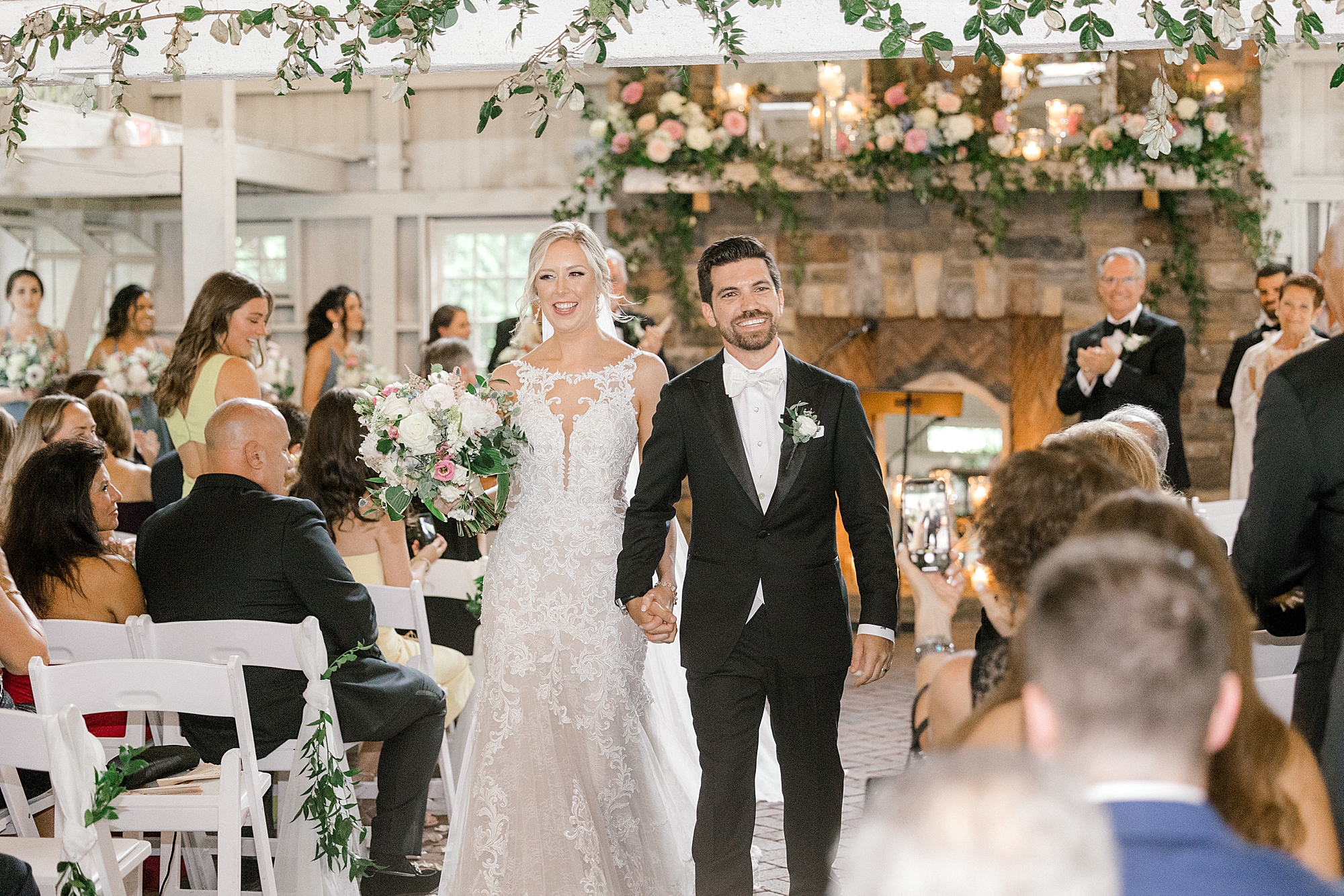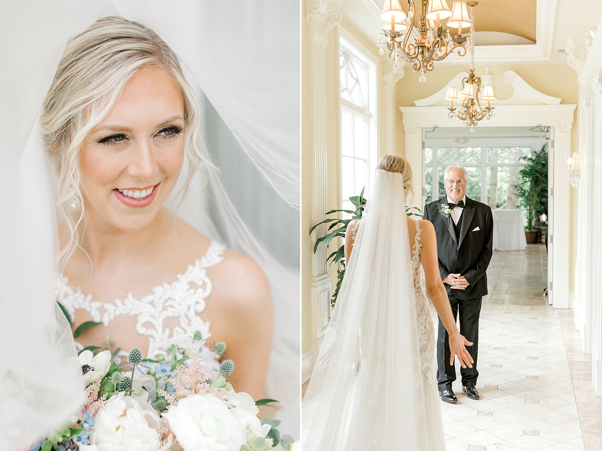 For this summer wedding, Lauren and Joe chose a beautiful pastel color palette that felt so classic and yet, really fresh. Lauren’s bridesmaids wore a dusty blue and carried bouquets of white, pink, and even some pops of blue. The same colors were echoed in their ceremony decor, and the amount of flowers adorning the space was unbelievable and looked absolutely gorgeous! Lauren and Joe’s reception was held in the stunning ballroom and with antique gold in the rest of their centerpieces and signs, everything looked picture perfect! Before their guests came in, Lauren and Joe had a beautiful reveal. They even had a chance to have a private moment on the dance floor together!