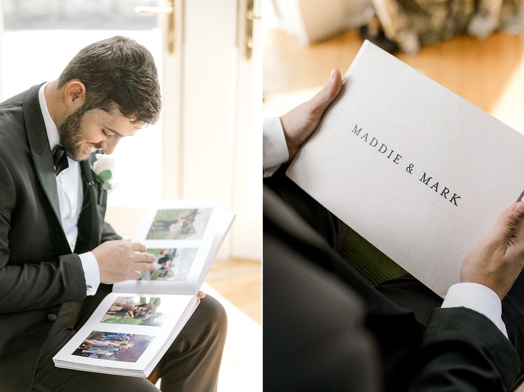 The Farmhouse in Hampton NJ is an absolutely beautiful venue for classic wedding days like Maddie and Mark’s. I was obsessed from the moment I walked in and saw where Maddie was getting ready. It was such a STUNNING space – including a gorgeous Chanel chandelier. I mean, seriously?!? Before the big day, I found out that Mark’s mom actually designed their invitation suite and monogram – so I couldn’t wait to see it. It was incredible in person! When it was time for Maddie to get into her dress, we made sure to include that Chanel chandelier in the photos, too. I think it really brought an elevated touch to her portraits! While they were getting ready, Maddie also sent Mark a scrapbook she made of photos filled with the last 10 years. It was incredible.