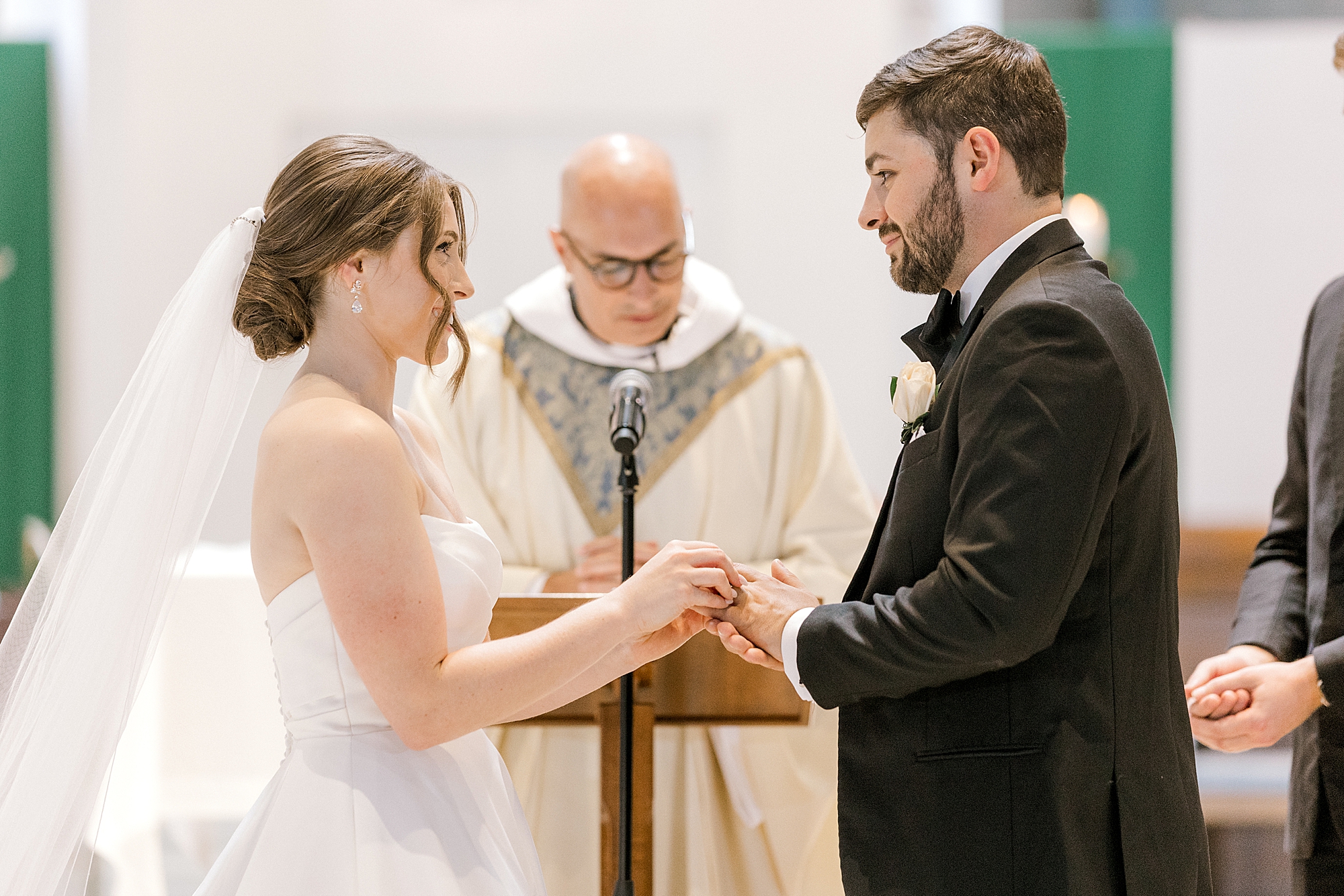 Maddie and Mark opted to do a first touch around the corner of one of the stone pillars at the church instead of a first look. It was such a sweet and tender moment. I always love when couples do a first touch instead of a first look – it’s a nice little calming moment and they still get the surprise during their ceremony! Mark and Maddie also chose to exchange letters during their first look and read them to each other. They tied the knot in a gorgeous ceremony at the church (on the grounds of the place Mark wen to school).